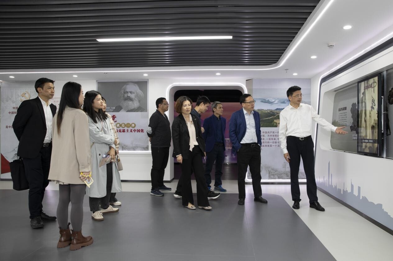 丁有波陪同调研组一行参观了党建阵地、虚拟演播室、“发现校园之美”展览”等。